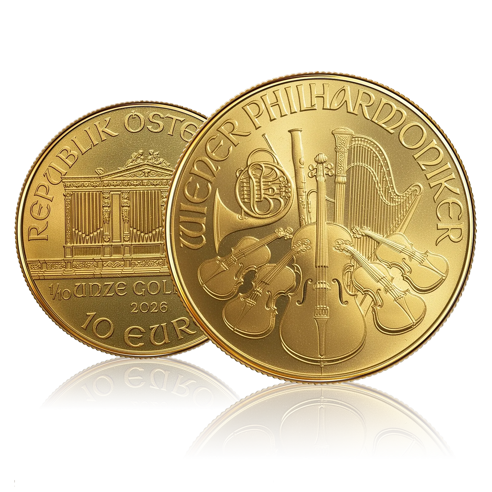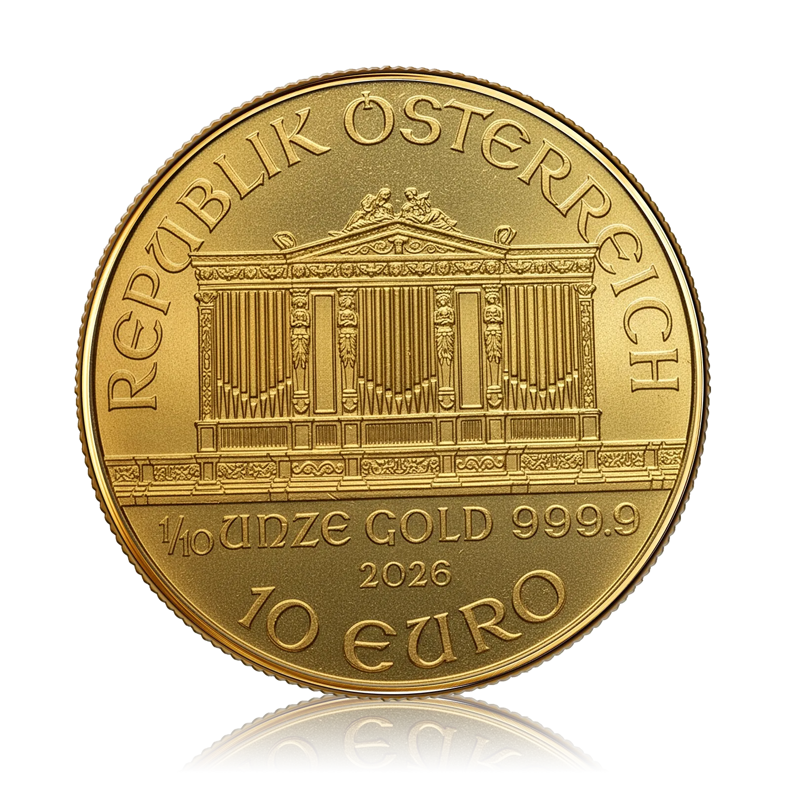 The 2026 1/10 ounce Gold Austrian Philharmonic bullion coin is produced with 99.99% pure gold. It features iconic designs honouring the Vienna Philharmonic, such as a stunning ensemble of musical instruments on the reverse and the Great Organ of the Musikverein on the obverse, combining artistic elegance with global recognition, making it a popular choice among collectors and investors alike.