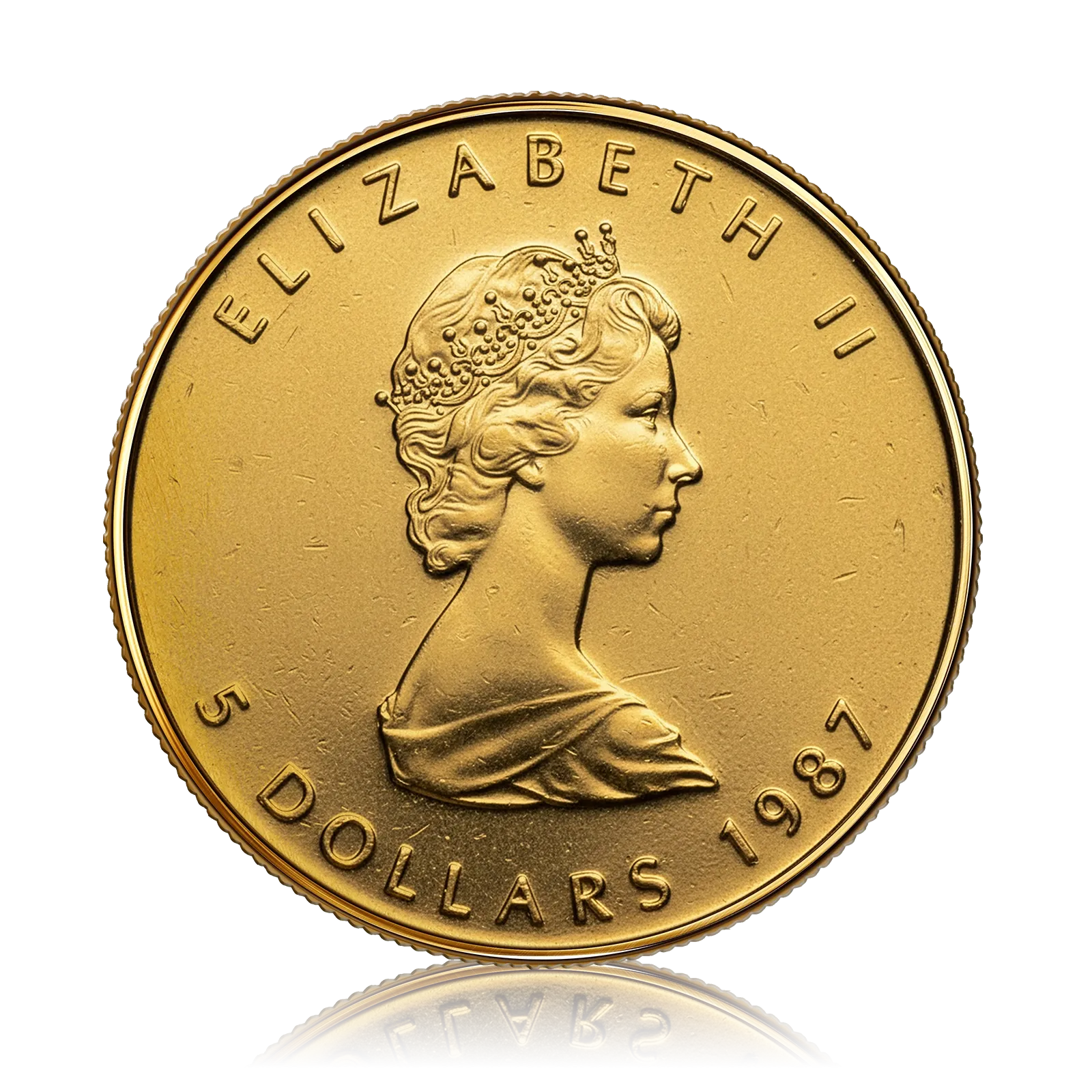 The 1987 1/10 oz Gold Canadian Maple Leaf is a wonderfully made coin with the classic maple leaf design struck in 24-karat gold. It is a valuable collectible and a condensed form of investment-grade gold, renowned for its purity and fine detail. Ideal for both investors and numismatists.