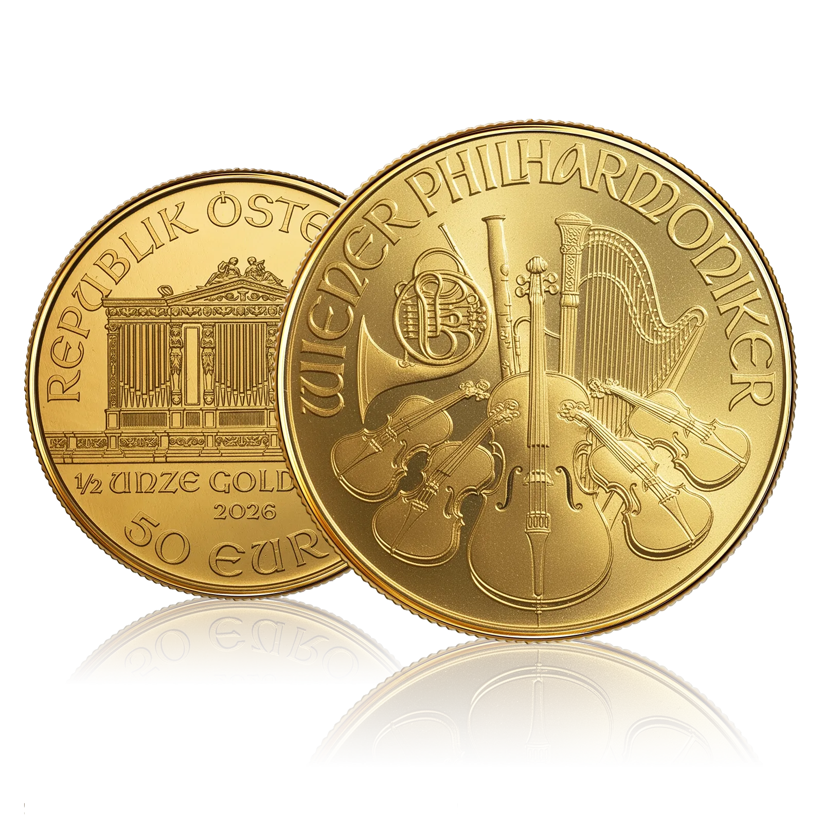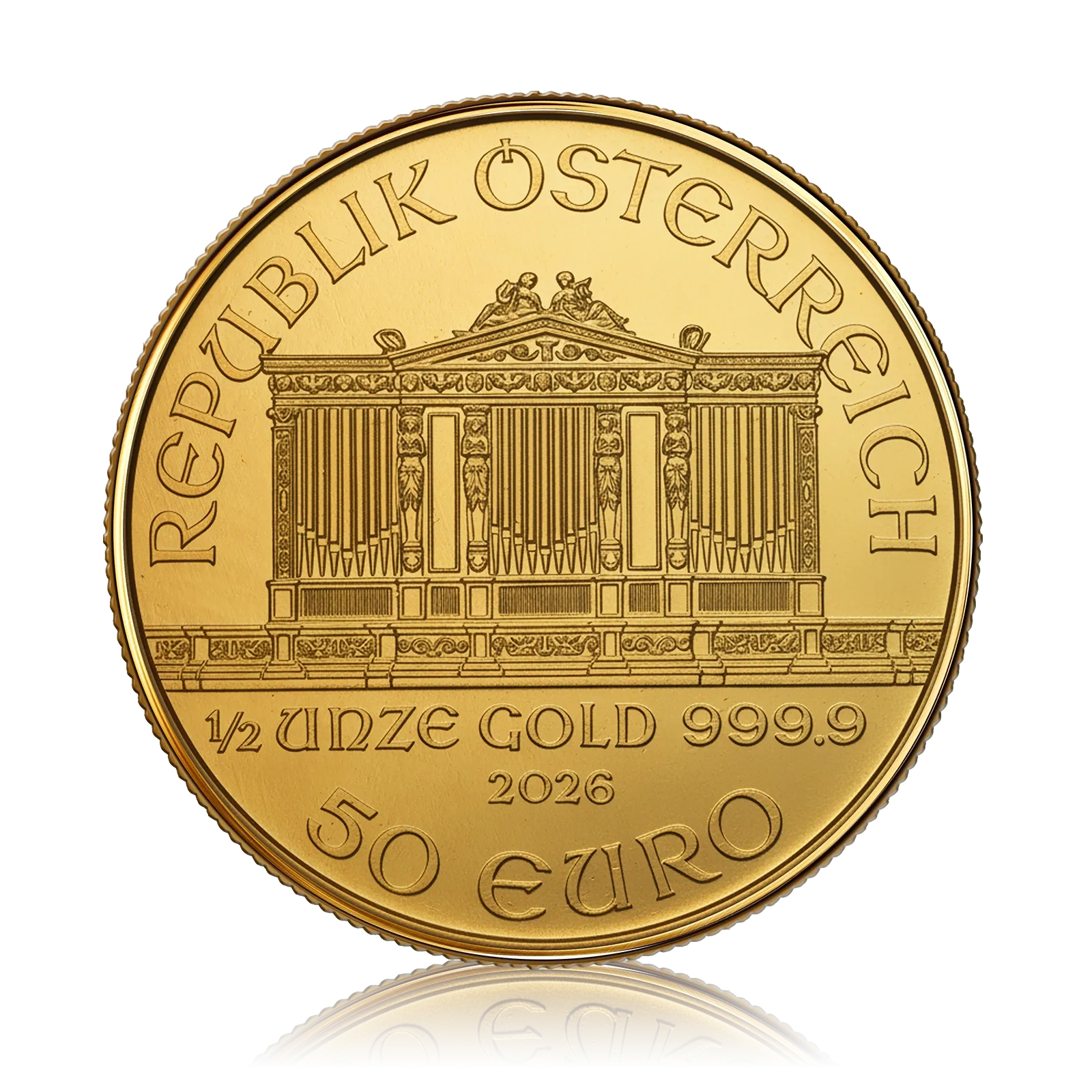 A.9999 pure gold coin, the 2026 1/2 oz Gold Austrian Philharmonic was produced by the Austrian Mint. It depicts the Great Organ of Vienna's Musikverein on the obverse and a variety of symphonic instruments on the reverse. It is legal tender in Austria and internationally recognised for its purity and design, with a face value of €50.