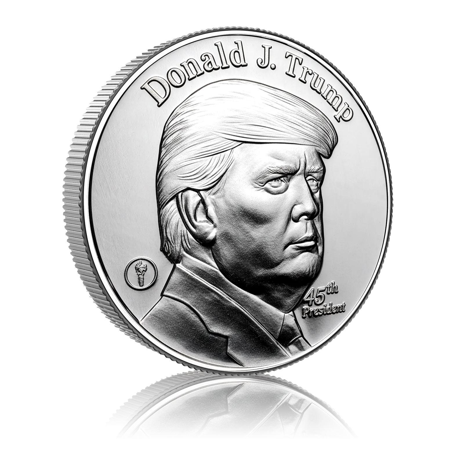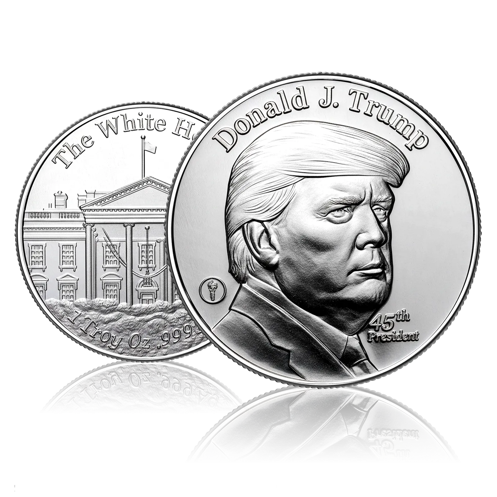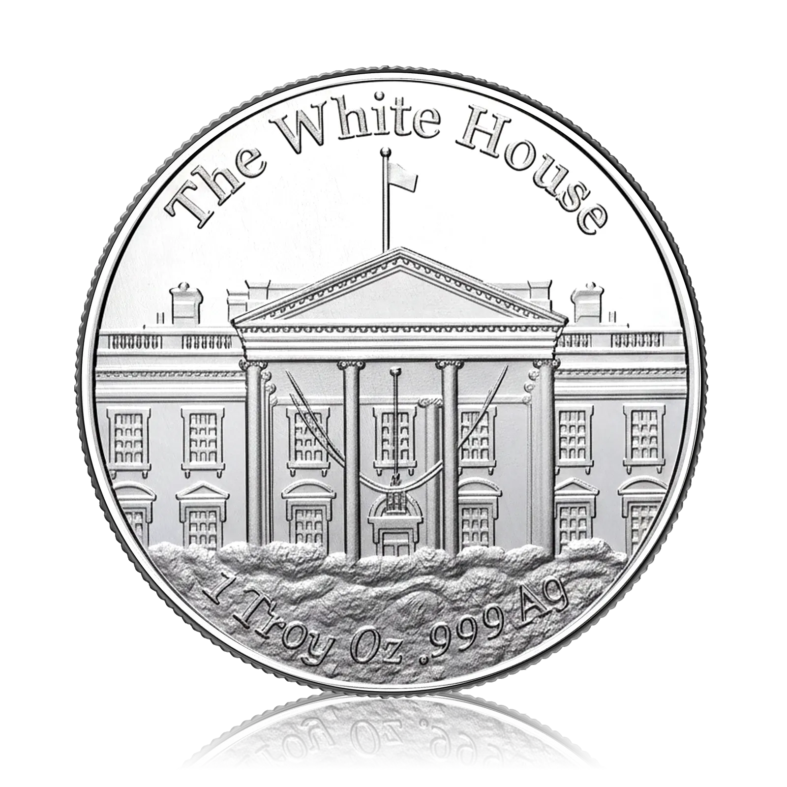 The 1 oz Silver Medal showing 45th President Donald Trump and the White House is a superbly struck collectible made of.999 pure silver that commemorates a significant era in American history. For collectors and lovers of presidential memorabilia, it is a desirable memento because to its intricate imagery and stunning finish. This piece provides both intrinsic silver value and commemorative significance in a compact, display-ready package.