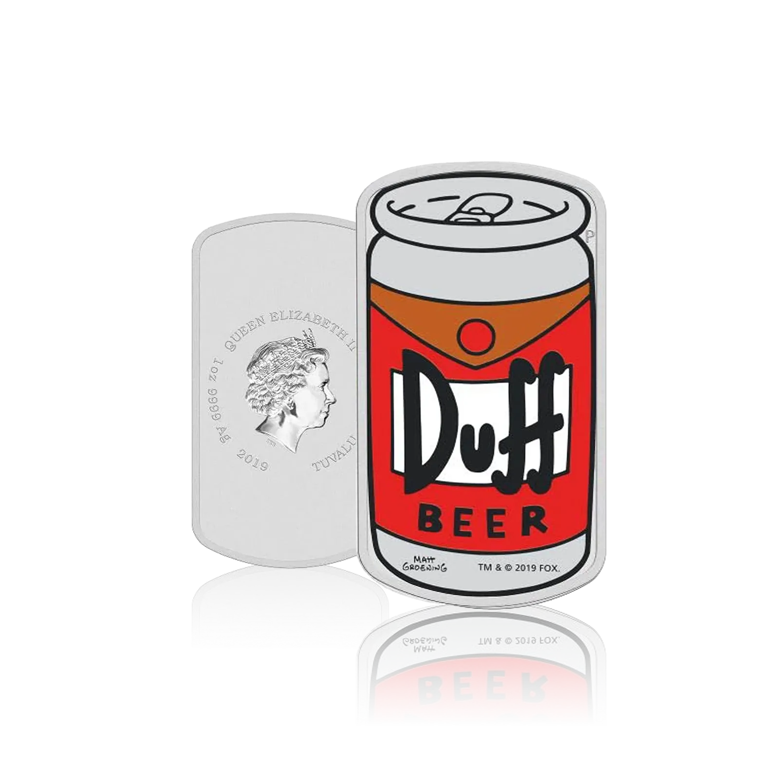 The rectangular coin’s reverse portrays a coloured image of a Duff beer can, Homer Simpson’s drink of choice and the most popular beer in Springfield. Included in the design is Matt Groening’s signature and The Perth Mint’s ‘P’ mintmark.