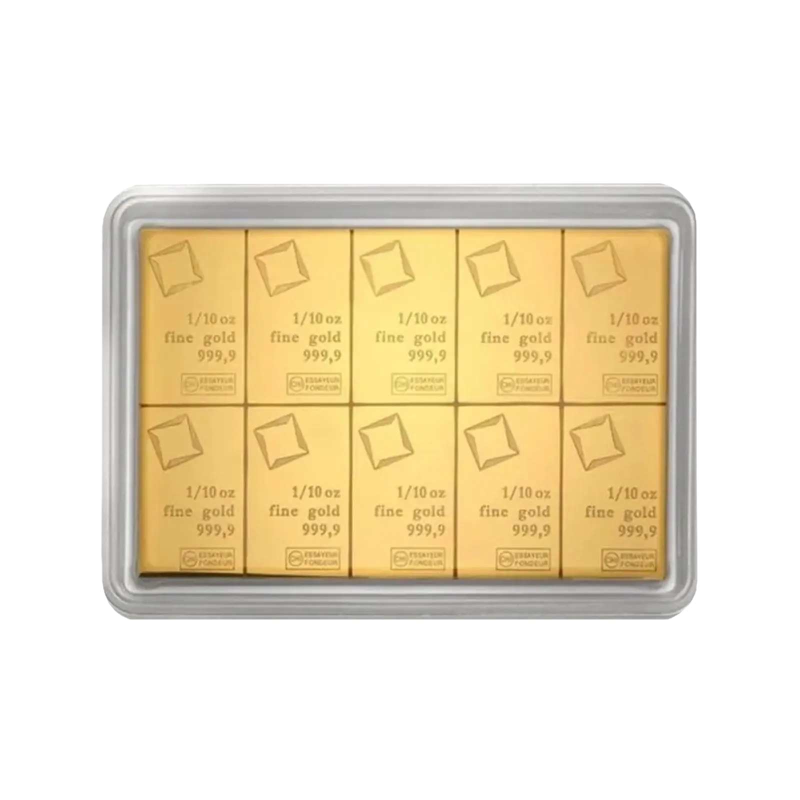 The 10 × 1/10 oz Gold Multigrams CombiBar (999.9) is a flexible bullion product consisting of ten separate 1/10 oz pieces.When 9999 fine gold bars are combined, they provide variety and ease of investment. It is possible to detach or retain each segment, combining liquidity with real-world ownership and inherent gold worth.