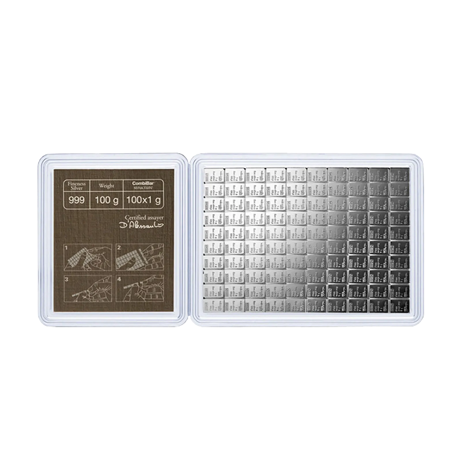 >Contains a total of 100 grams of fine silver, divisible into 100 individual 1g bars