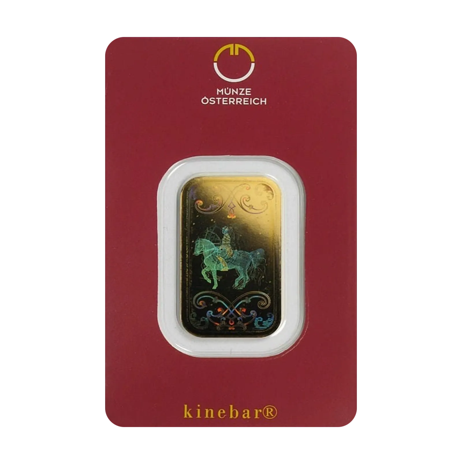 the Kinebars are gold bars produced by the Austrian Mint with an engraved security element, the KINEGRAM, a special effect developed and patented by Landis & Gyr. The world-famous white Lipizzaner horse of the Spanish Riding School in Vienna features on the design of the Austrian Mint’s Kinebars. As their position changes according to the angle at which the design is viewed, horse and rider appear to jump. This is why they are favoured as gifts and can even be worked into jewellery. The Austrian Mint Kinebar is available in 1 gramme, 5 gramme and 10 gramme bars.