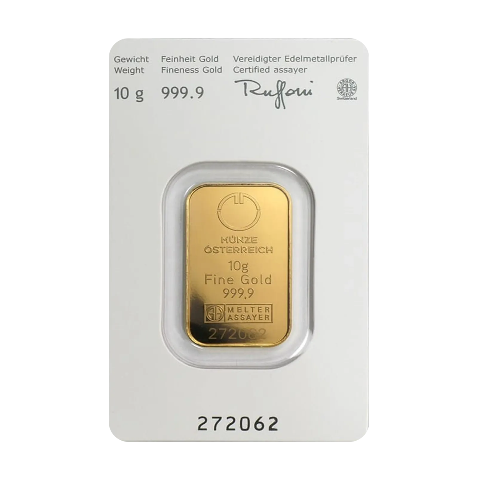 A 10 gram Kinebar produced and manufactured by the Austrian Mint. This bar is minted in pure gold 999.9 and comes complete in a tamper proof sealed packaging and an embeded certificate on the rear.