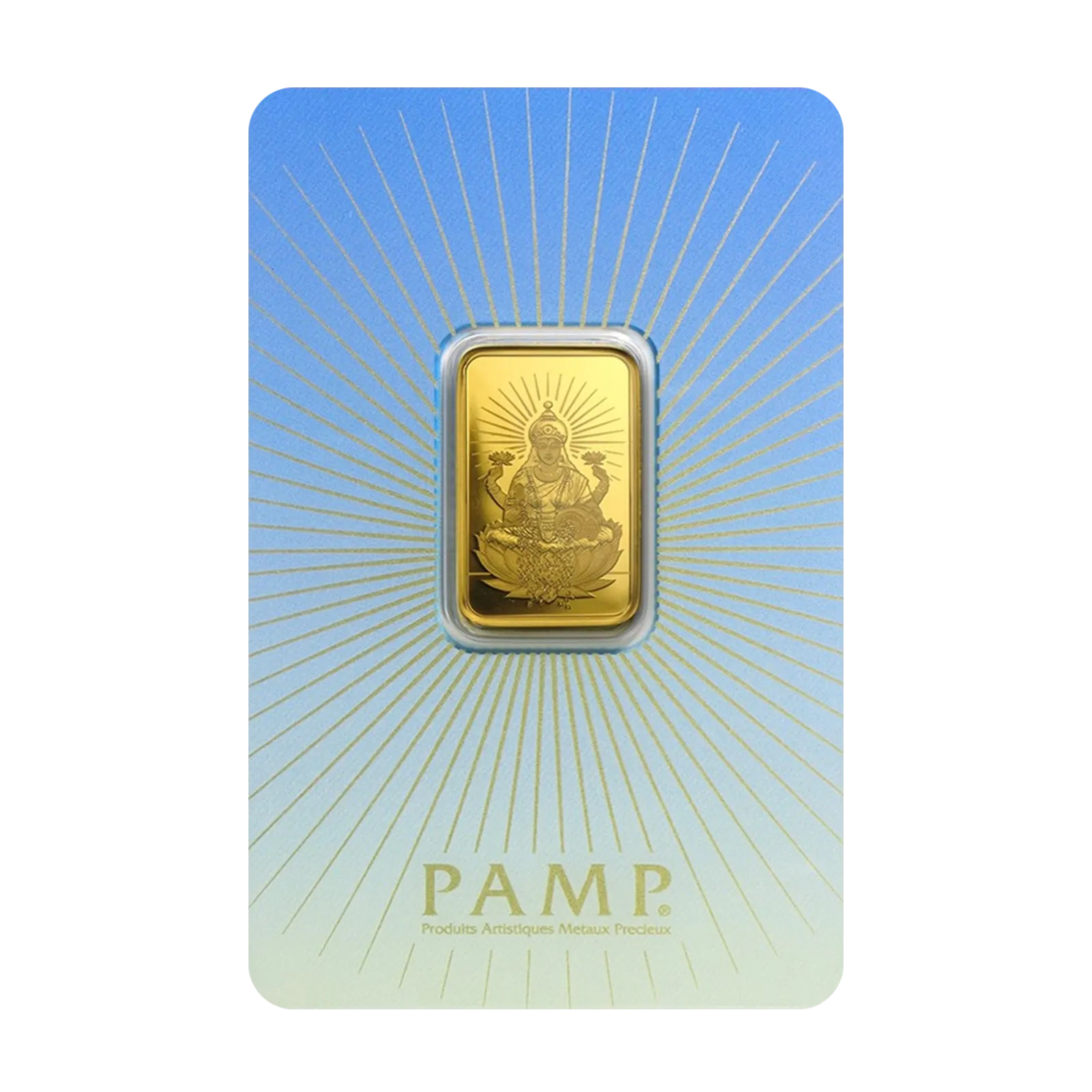 10g PAMP 'Faith' Lakshmi Gold Bar (999.9) - This wonderfully made 24k (999.9 purity) gold bar depicts Goddess Lakshmi, who represents prosperity and good fortune. PAMP Suisse produces it, and it arrives securely sealed with assay certification to ensure authenticity and quality.