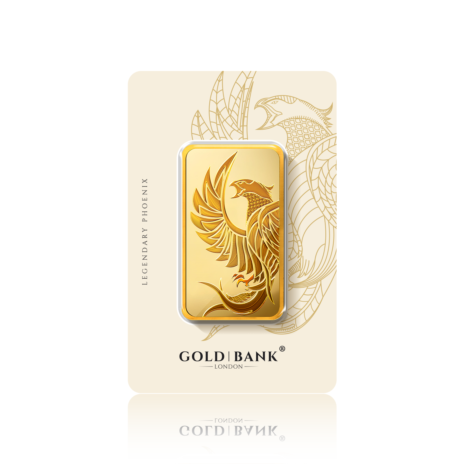 The 1 Oz Gold Bank Legendary Phoenix Gold Bar (999.9) is a premium investment-grade gold bar crafted from pure 24-karat gold. Combining classic artistry with guaranteed purity and authenticity from Gold Bank London, it features the magnificent Phoenix design, which represents power and rebirth.