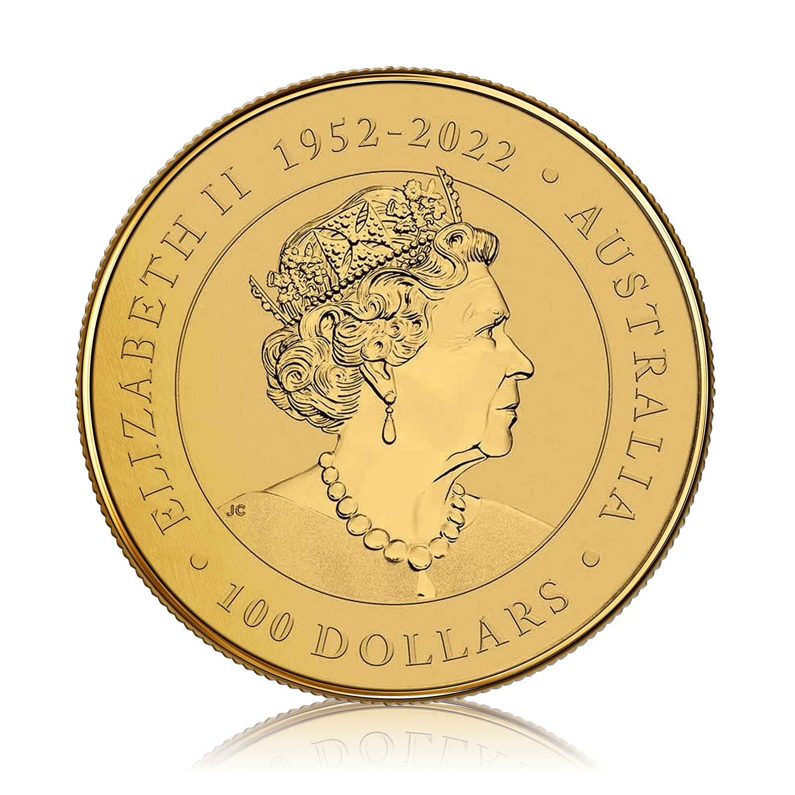 >Obverse displays the Jody Clark “Queen Elizabeth II Memorial” effigy with inscription “ELIZABETH II 1952–2022 • AUSTRALIA • 100 DOLLARS”