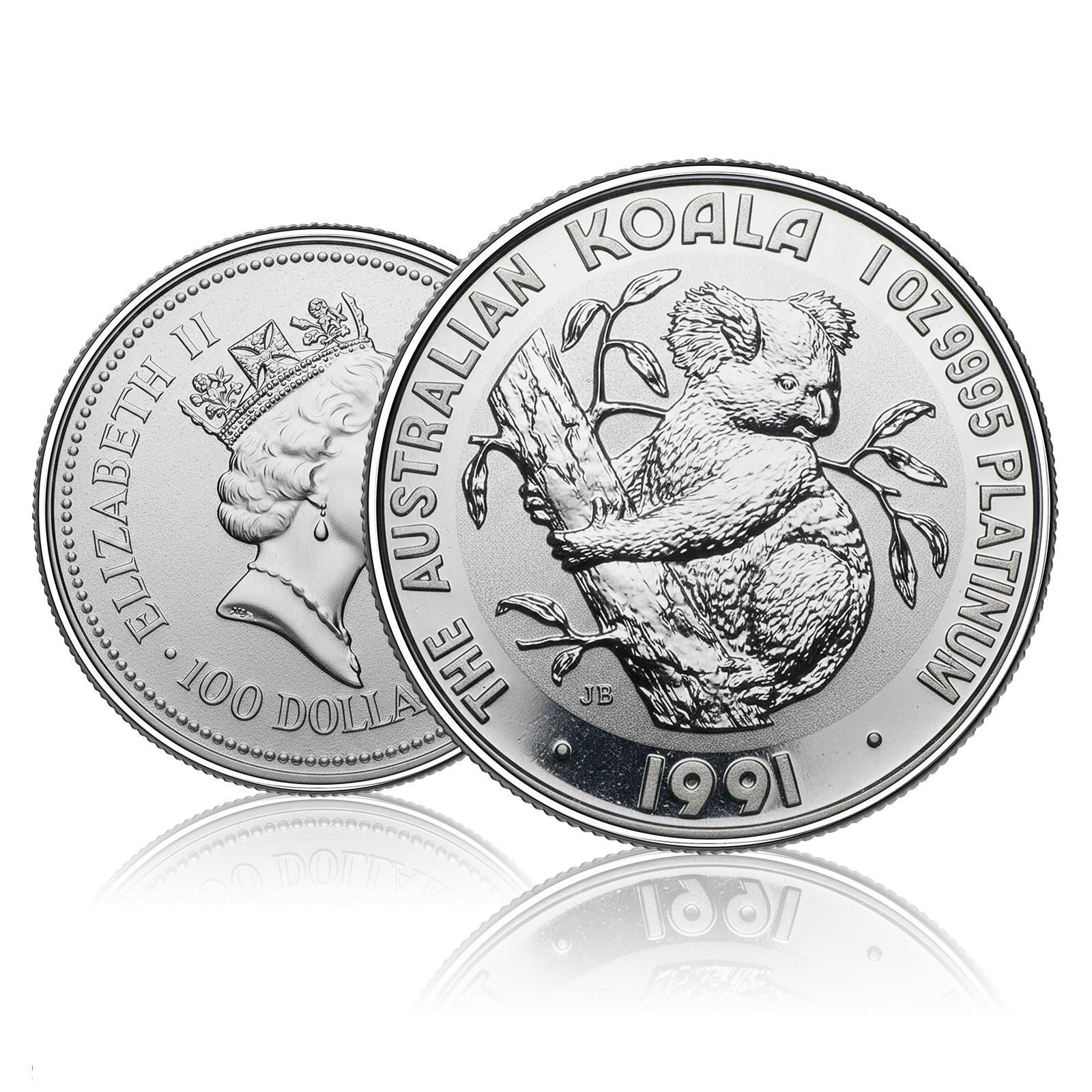 1 ounce Platinum Perth Mint Australian Koala (1991) - Minted by the Perth Mint in 1991, this rare one-ounce platinum bullion coin features the famous Australian Koala. It is a remarkable piece for both investors and collectors due to its excellent detail and collectible potential.