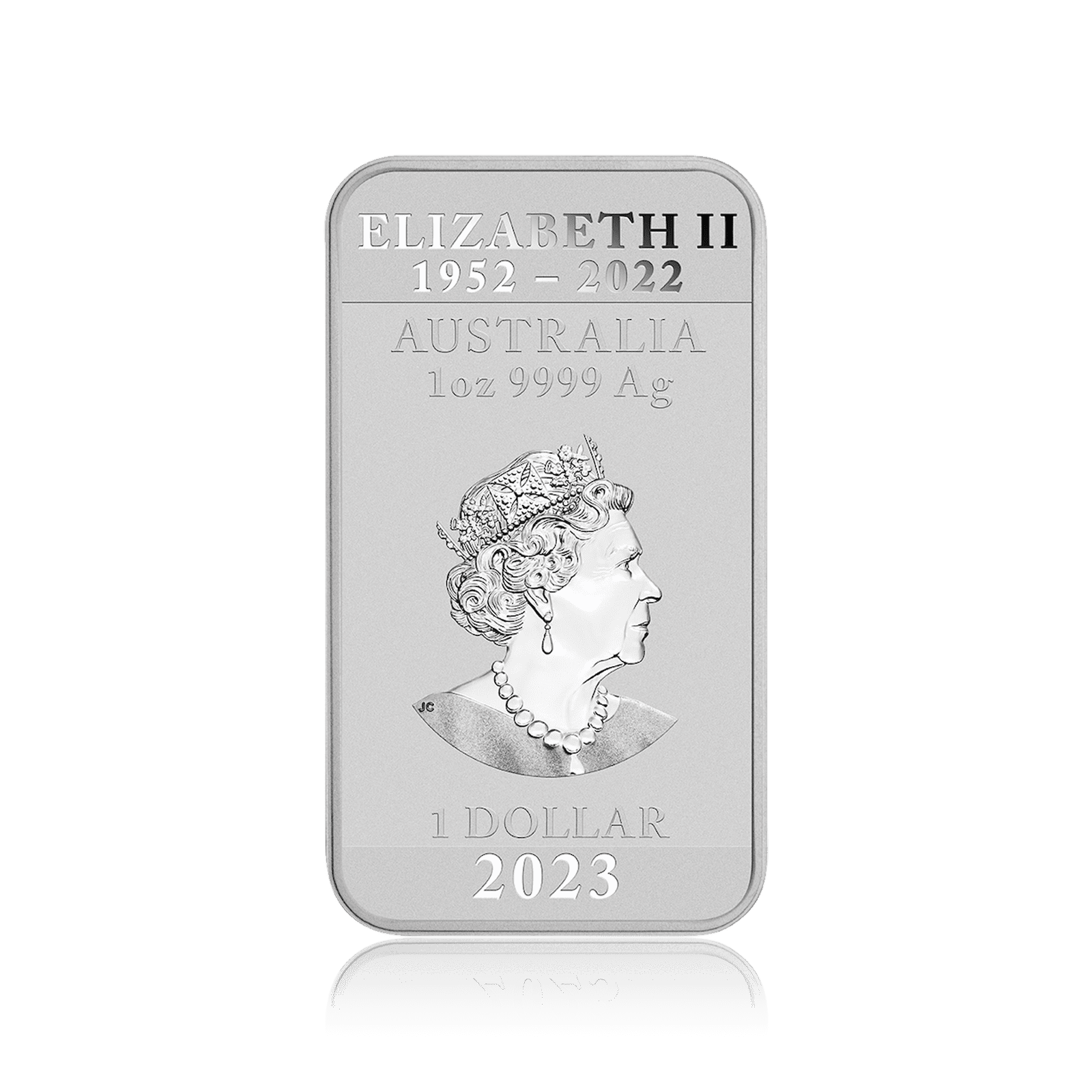 The 1 Ounce Silver Rectangular Dragon 2023 Minted in Pure Silver of 999.9 Purity. Produced And Manufactured by the Perth Mint Australia.