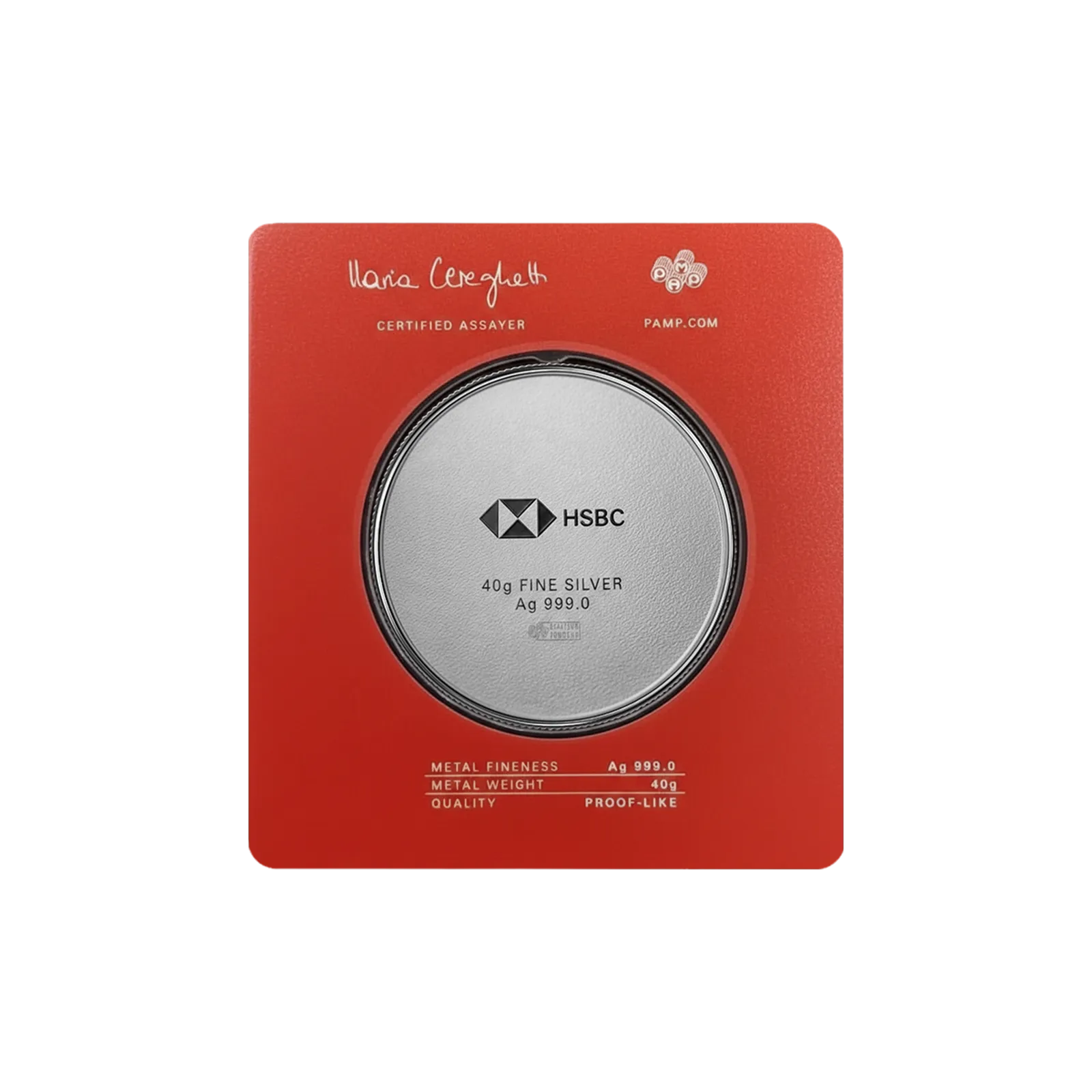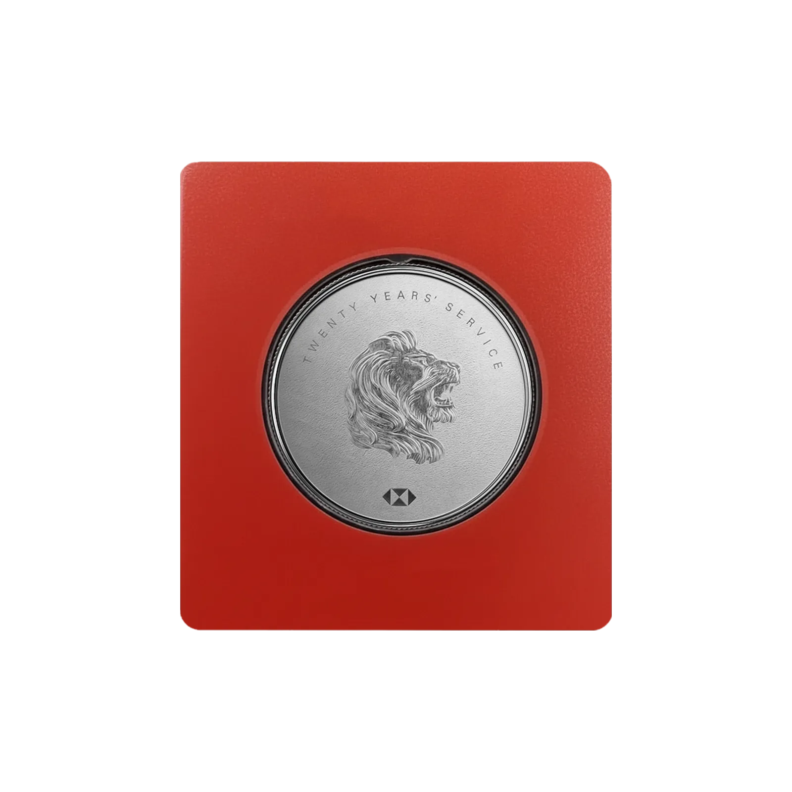 The 40g Silver PAMP HSBC 20 Years of Service Coin in Card is a commemorative silver coin marking two decades of service. It's made of 999.9 pure silver and combines elegance with long-lasting value, making it a valuable keepsake for both employees and collectors. It guarantees both display and preservation because it is enclosed in a protective card.