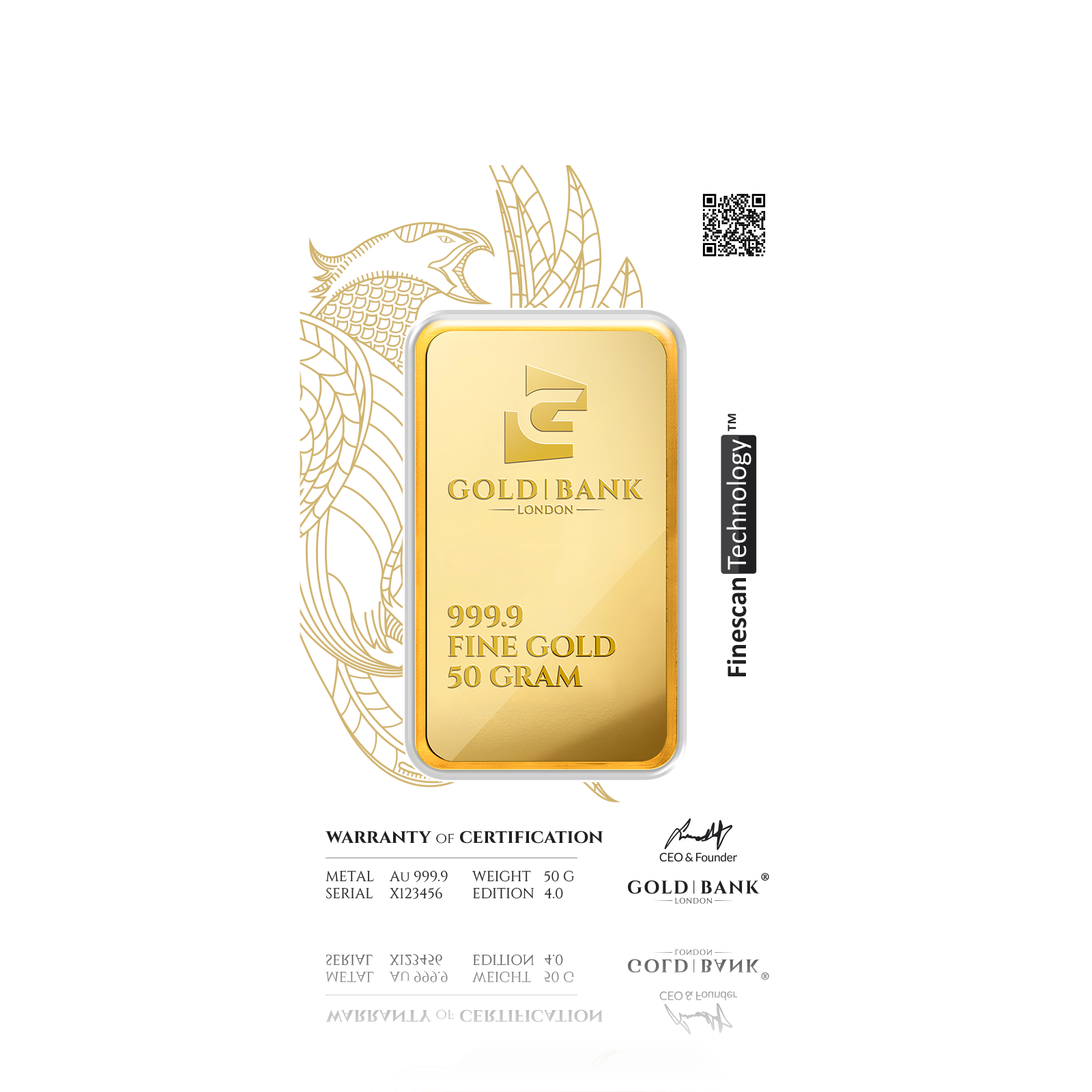 The 50g Gold Bank Legendary Phoenix Gold Bar (999.9) is a premium investment-grade gold bar crafted of pure 24-karat gold. Expertly crafted with a refined Phoenix design symbolizing power and renewal, it combines timeless artistry with the guaranteed purity and authenticity from Gold Bank London.