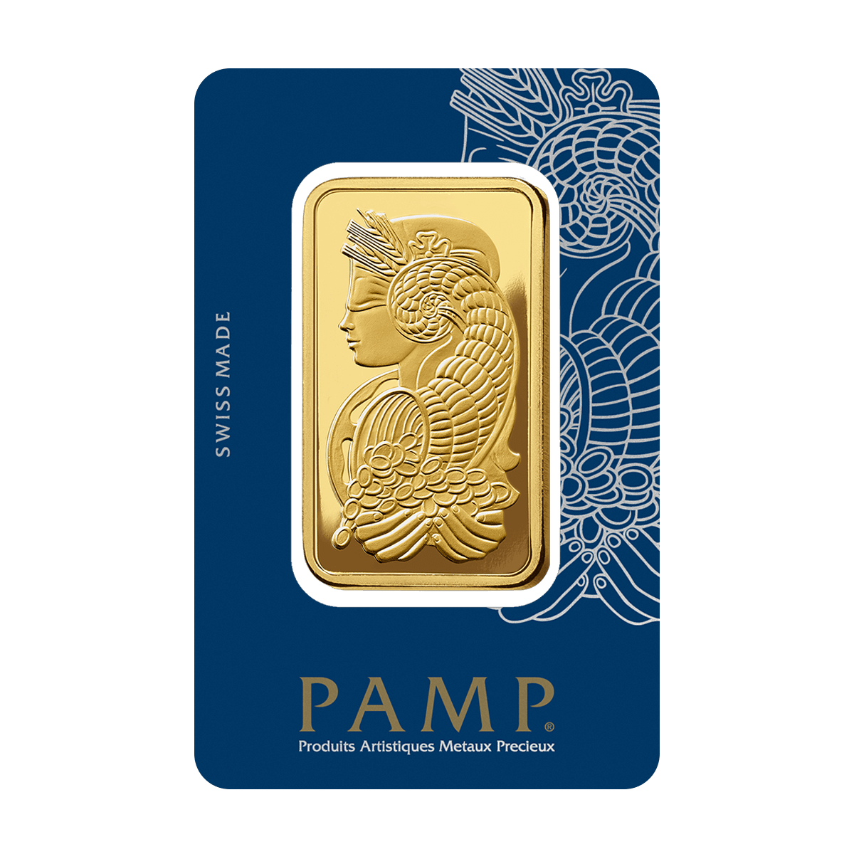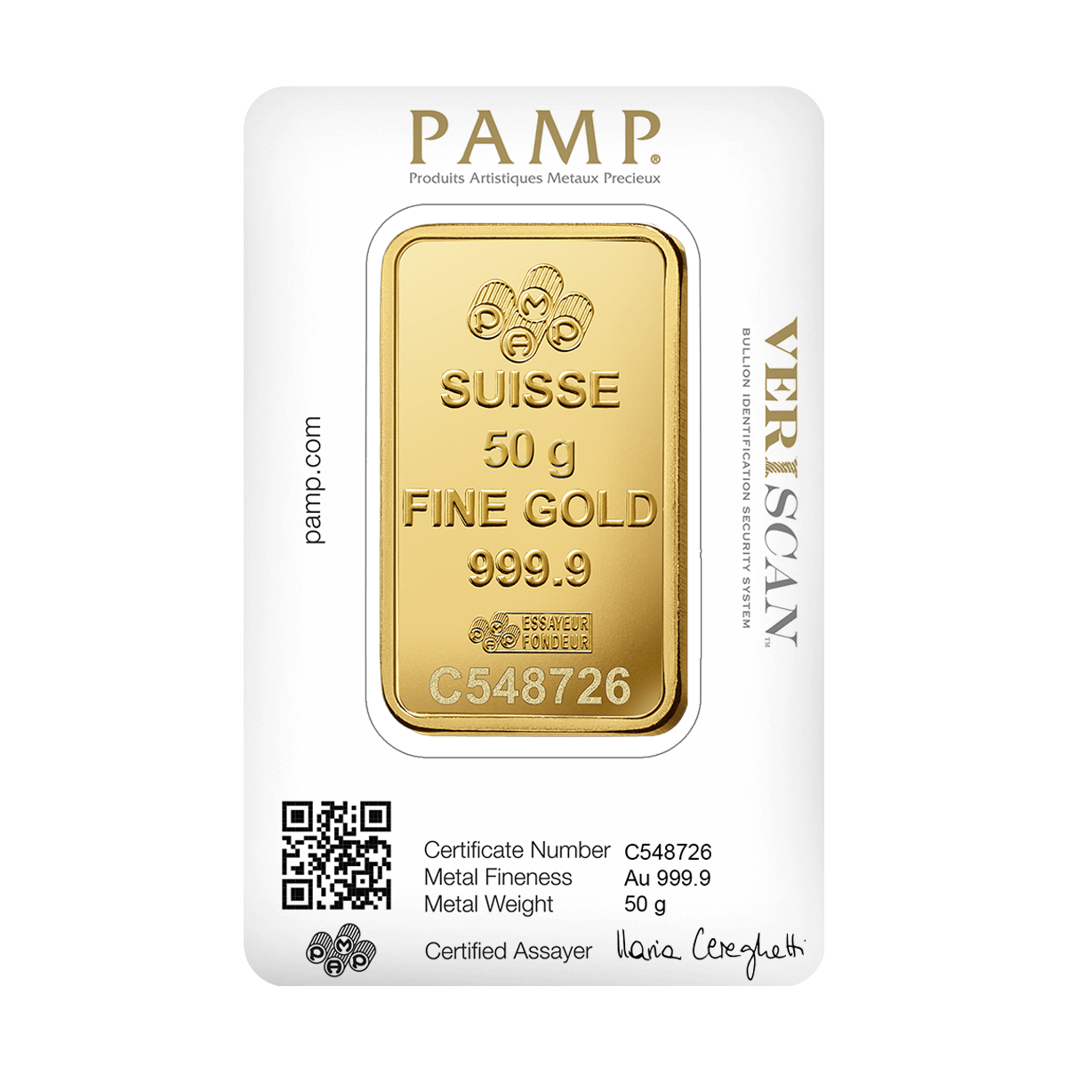 50 Gram Investment Gold Bar Manufactured by PAMP (Produits Artistiques Métaux Précieux), founded in Switzerland in 1977. This Investment Gold Bar features the famous Lady fortuna portrait on the front and fully Packaged with certificate and unique identifying number.