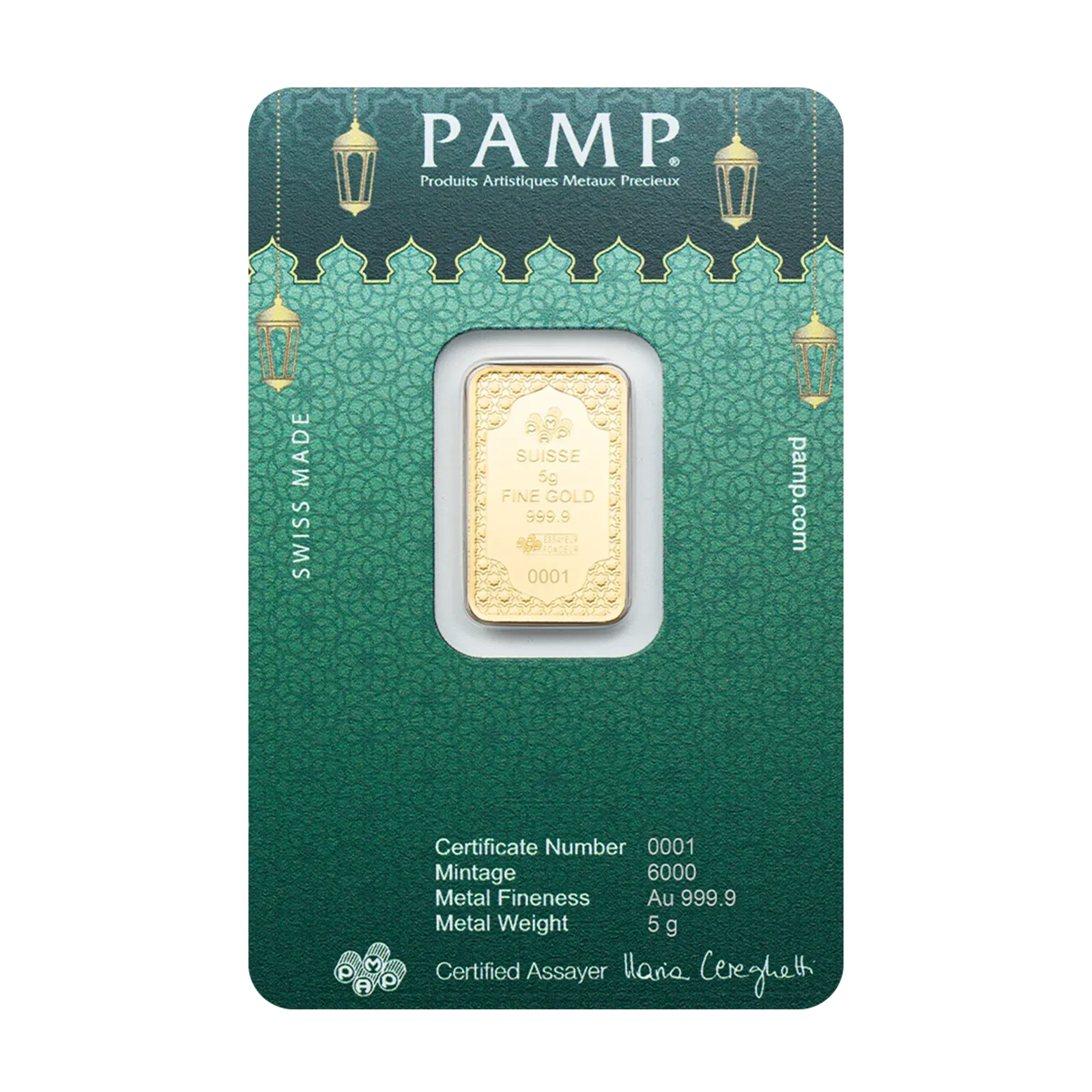 Celebrate the spirit of Eid with the wonderfully designed 5g PAMP Eid Mubarak Gold Bar (999.9), which is constructed of 24-karat pure gold with excellent Swiss precision. PAMP Suisse created this limited-edition bar with stunning Eid Mubarak lettering, making it both a memorable gift and a timeless investment.