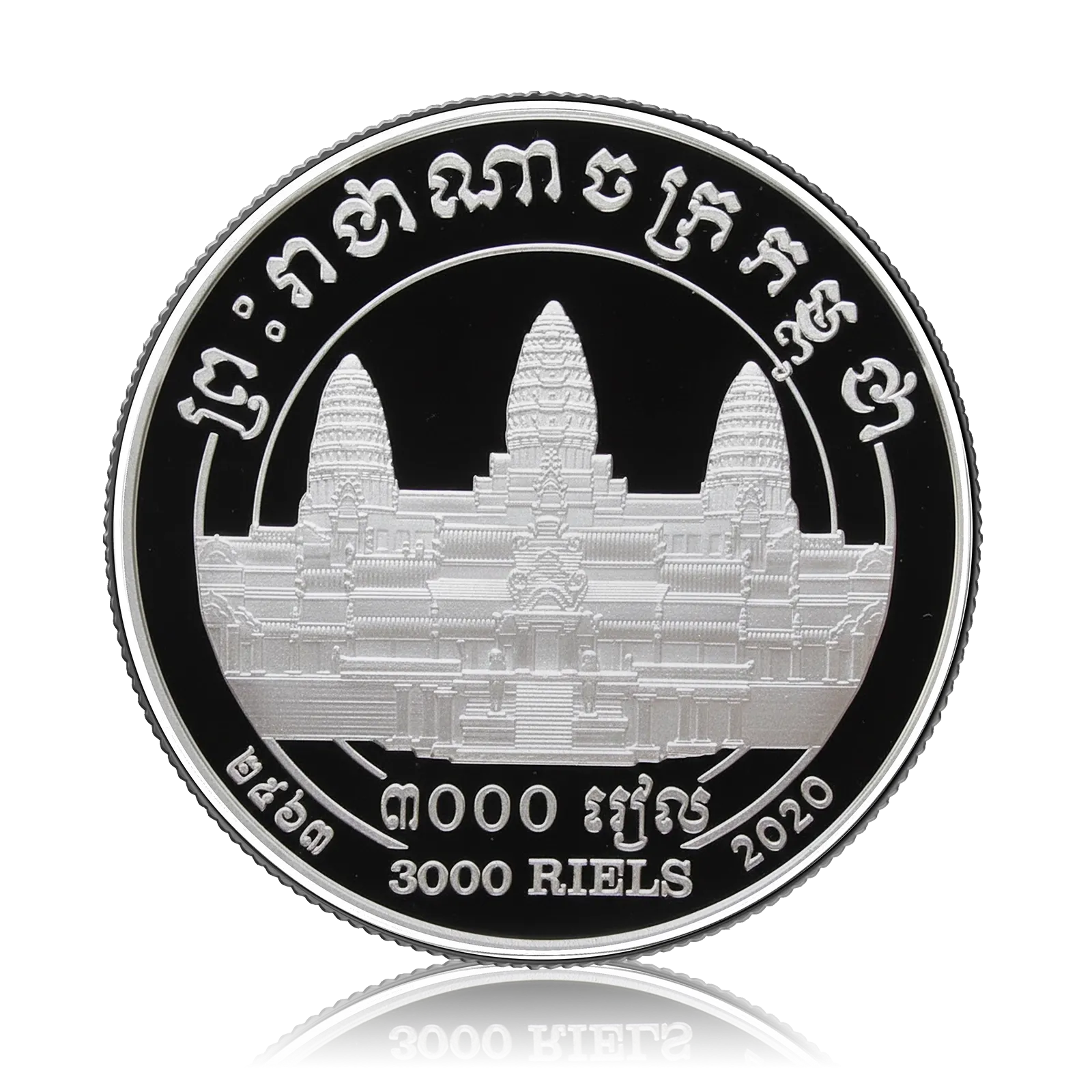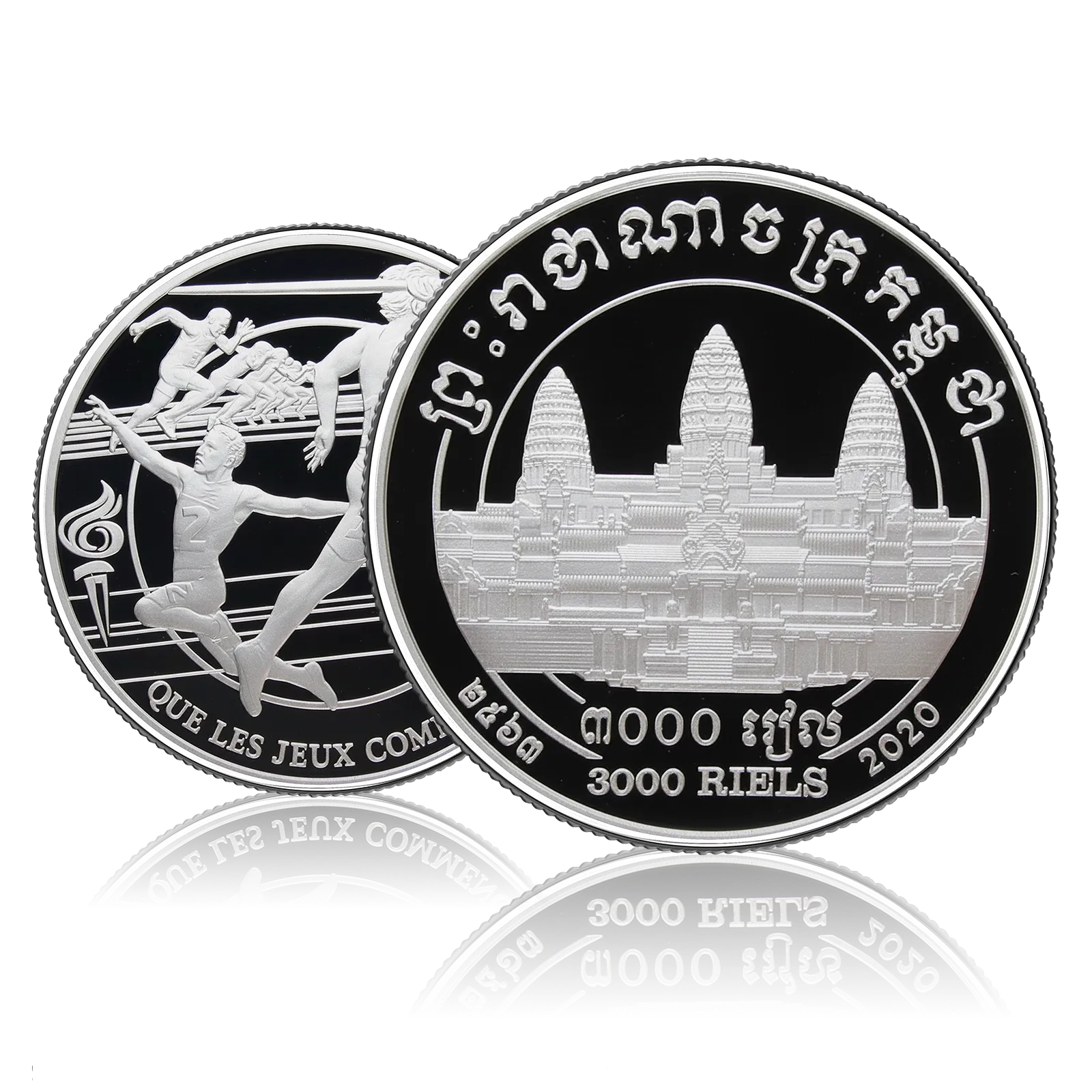 The Cambodia 3000 Riels Silver Coin (2020) is a 0.999 pure silver coin weighing 31.10 g and commemorating the Tokyo 2020 Olympics. Athletes and the Olympic torch are seen on the back, along with the phrase "Que les jeux commencent!" The obverse of the coin portrays the famous Angkor Wat temple with texts in Khmer and Latin. This limited-edition coin, with a face value of 3,000 riels, combines Cambodian traditional heritage with international sporting celebrations, making it a desirable collectible for collectors and investors both.