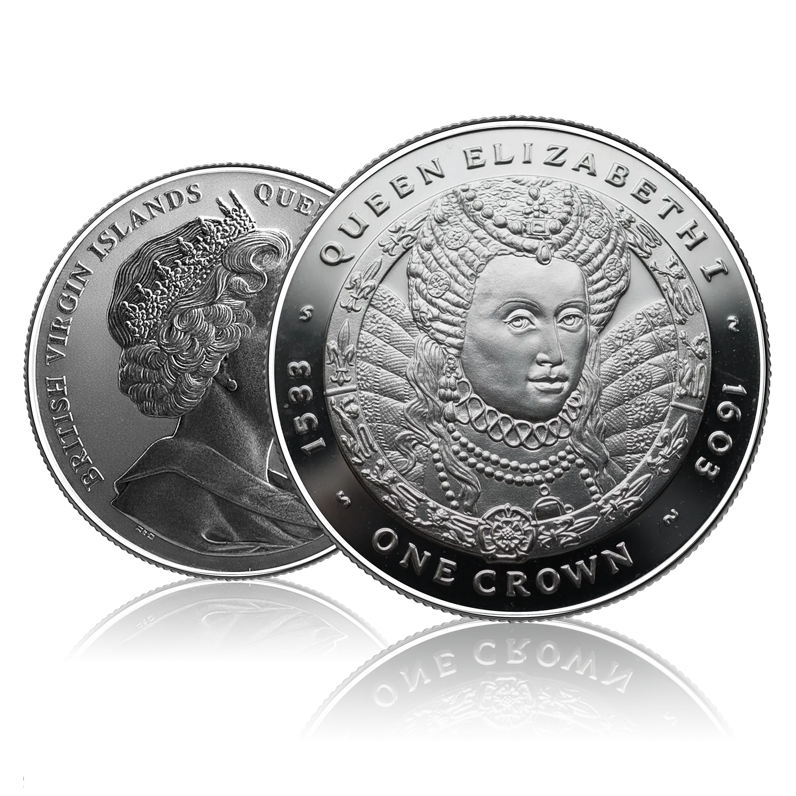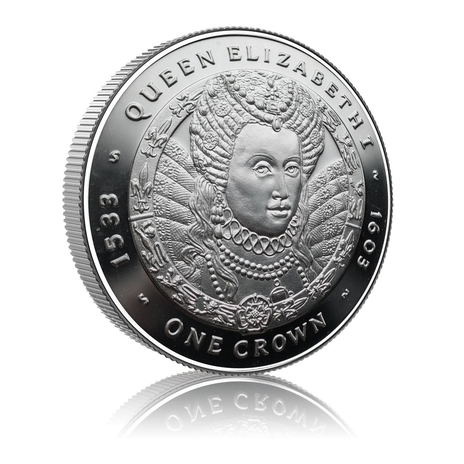 Made of sterling silver (.925), it has a diameter of 38.61 mm and weighs 28.28 g. It honours royal heritage by being issued as a £1 crown proof coin with Queen Elizabeth II on the obverse and Queen Elizabeth I on the reverse.