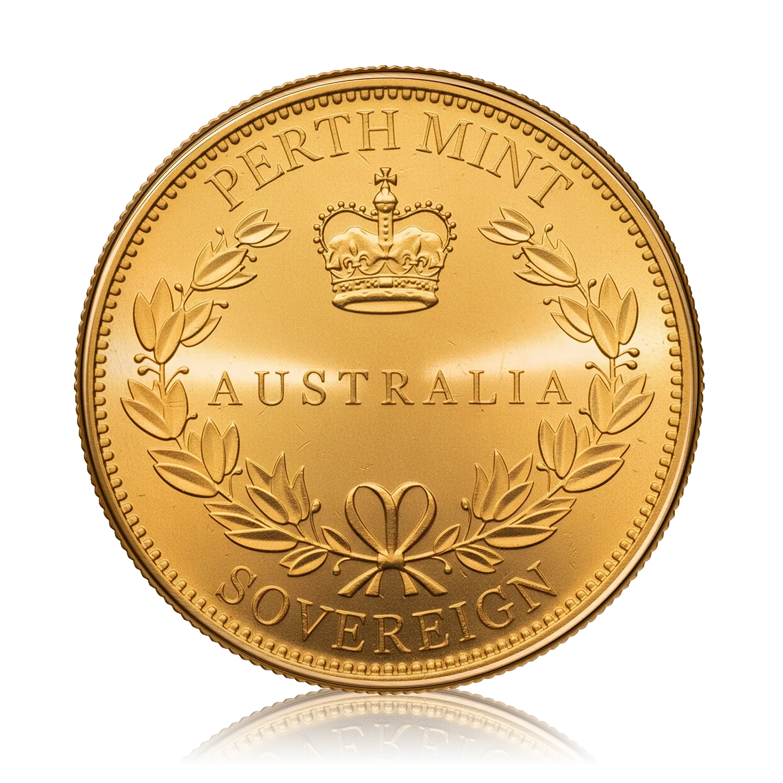 >Features of reverse design St. Edward's Crown, laurel wreath, mint mark "P," "AUSTRALIA," and "SOVEREIGN"