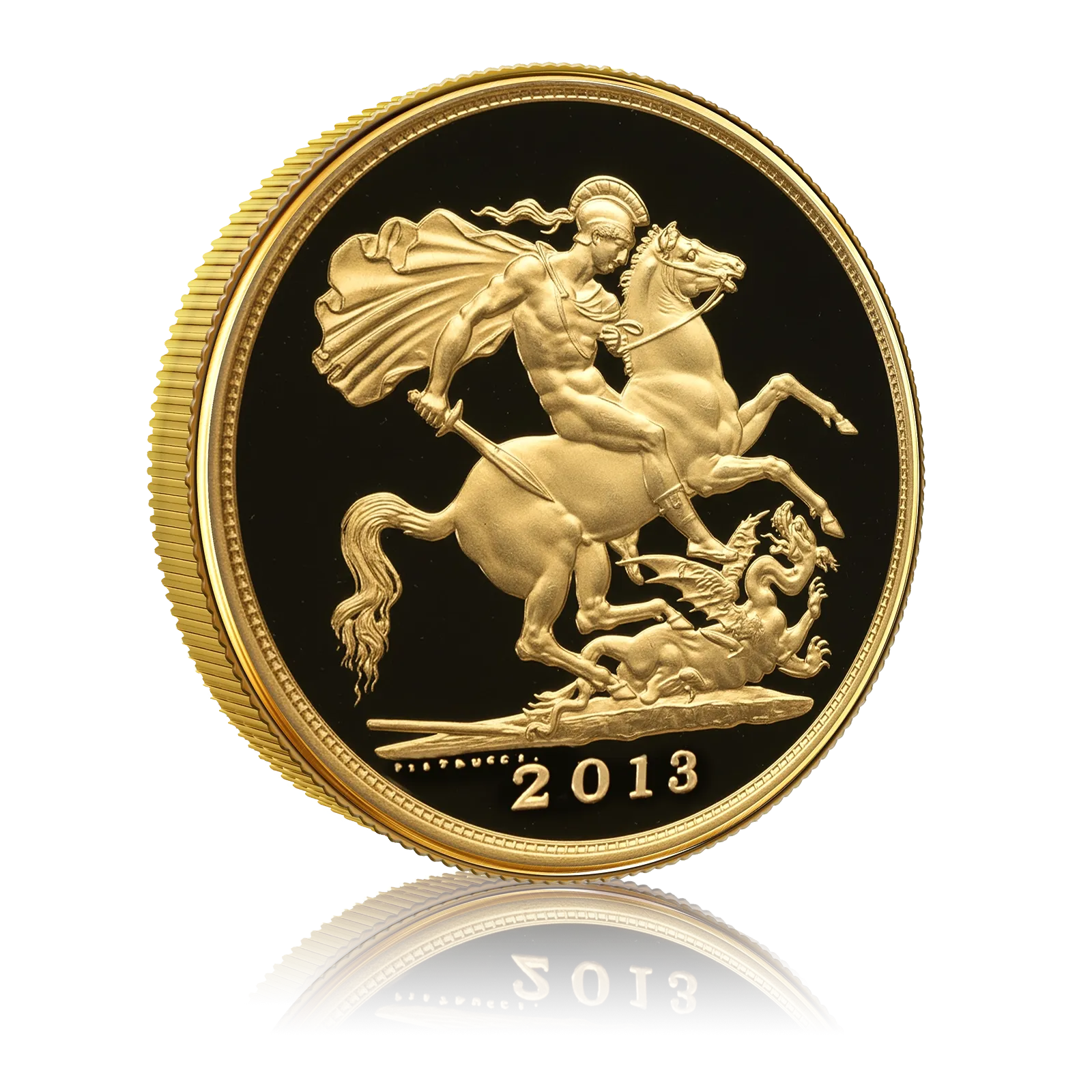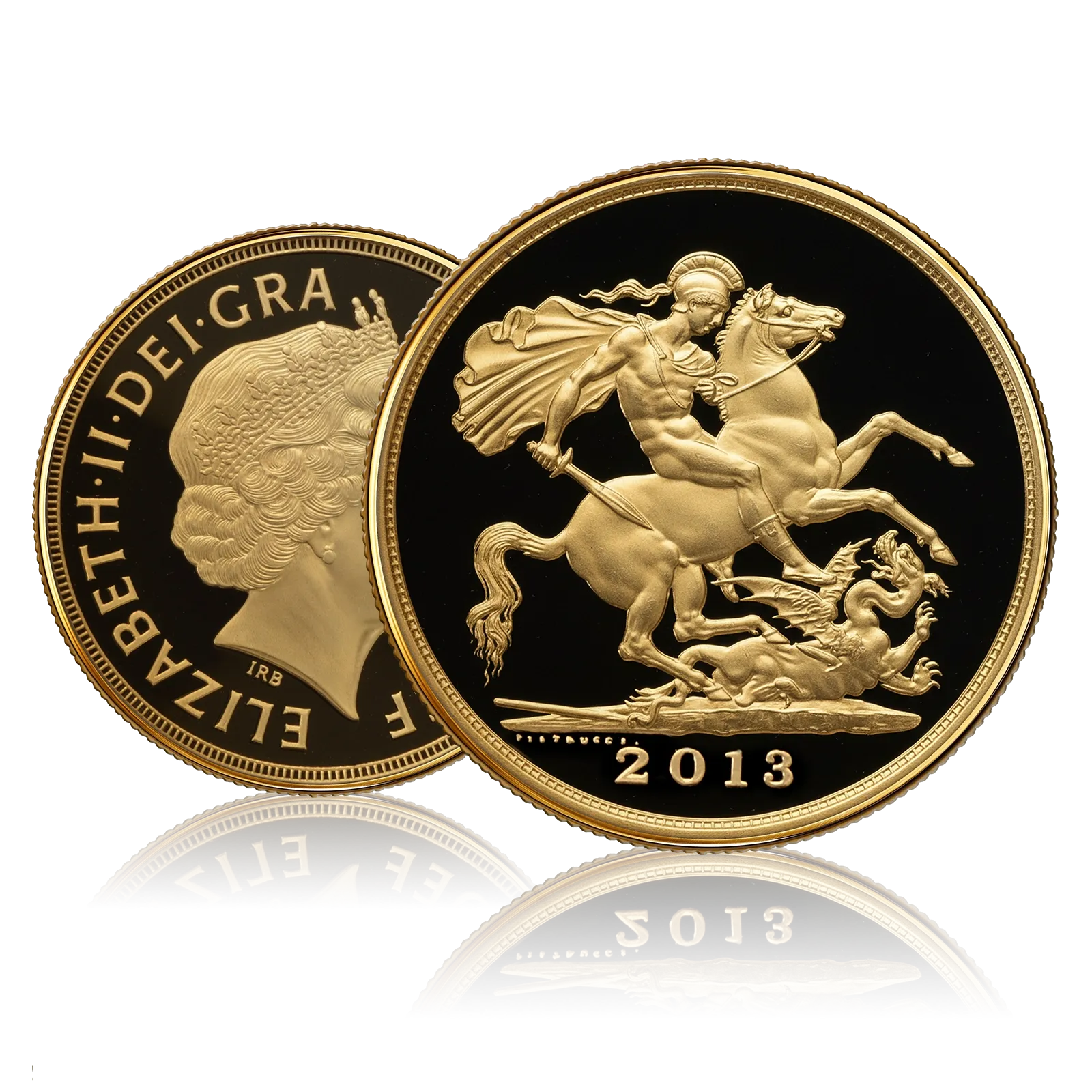 The Royal Mint's Gold Quintuple Sovereign (2013) is a distinguished large-format gold coin with excellent detail and the iconic St. George and Dragon symbol. It is a unique object valued by collectors for both its craftsmanship and rarity due to its remarkable weight and small mintage.