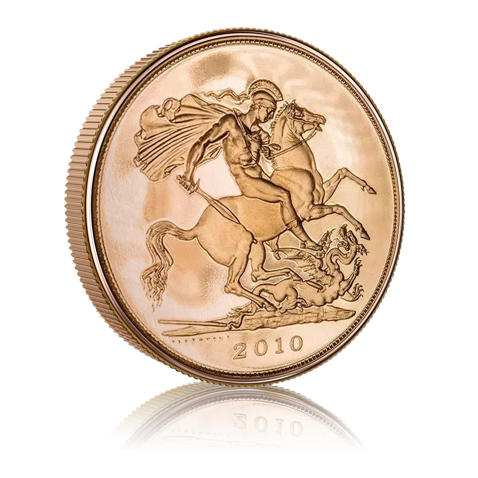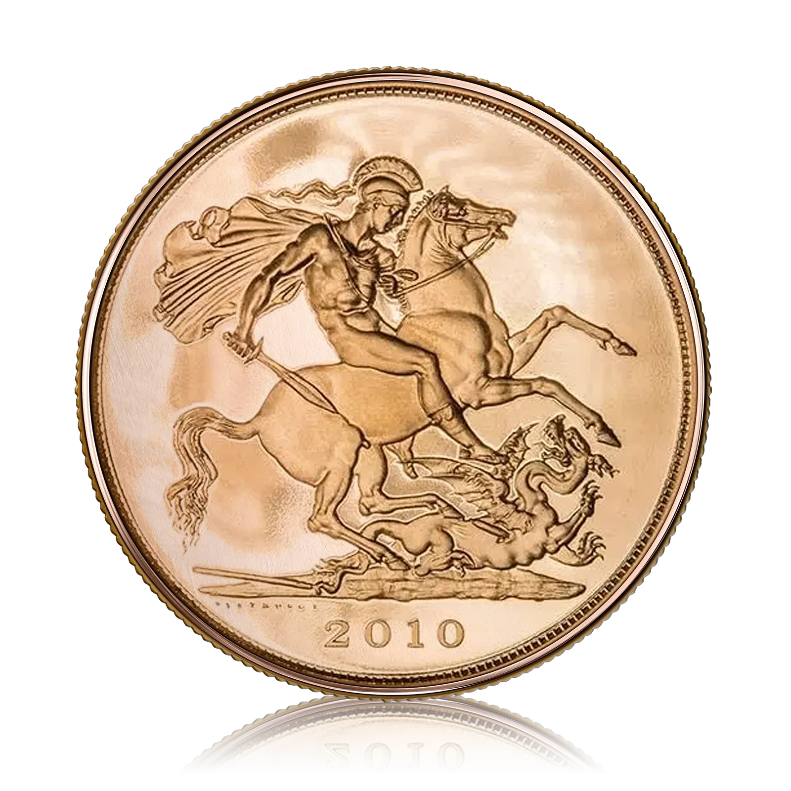 The 2010 Gold Proof Sovereign Five-Coin Collection is a premium collection made by The Royal Mint that includes five coins: Quintuple Sovereign (£5), Double Sovereign (£2), Sovereign (£1), Half Sovereign, and Quarter Sovereign. Each 22-carat gold coin includes Benedetto Pistrucci's classic St George and the Dragon design on the reverse and Ian Rank-Broadley's picture of Queen Elizabeth II on the obverse. This collection, which is extremely sought-after by both investors and collectors, is limited to just 1,750 units.