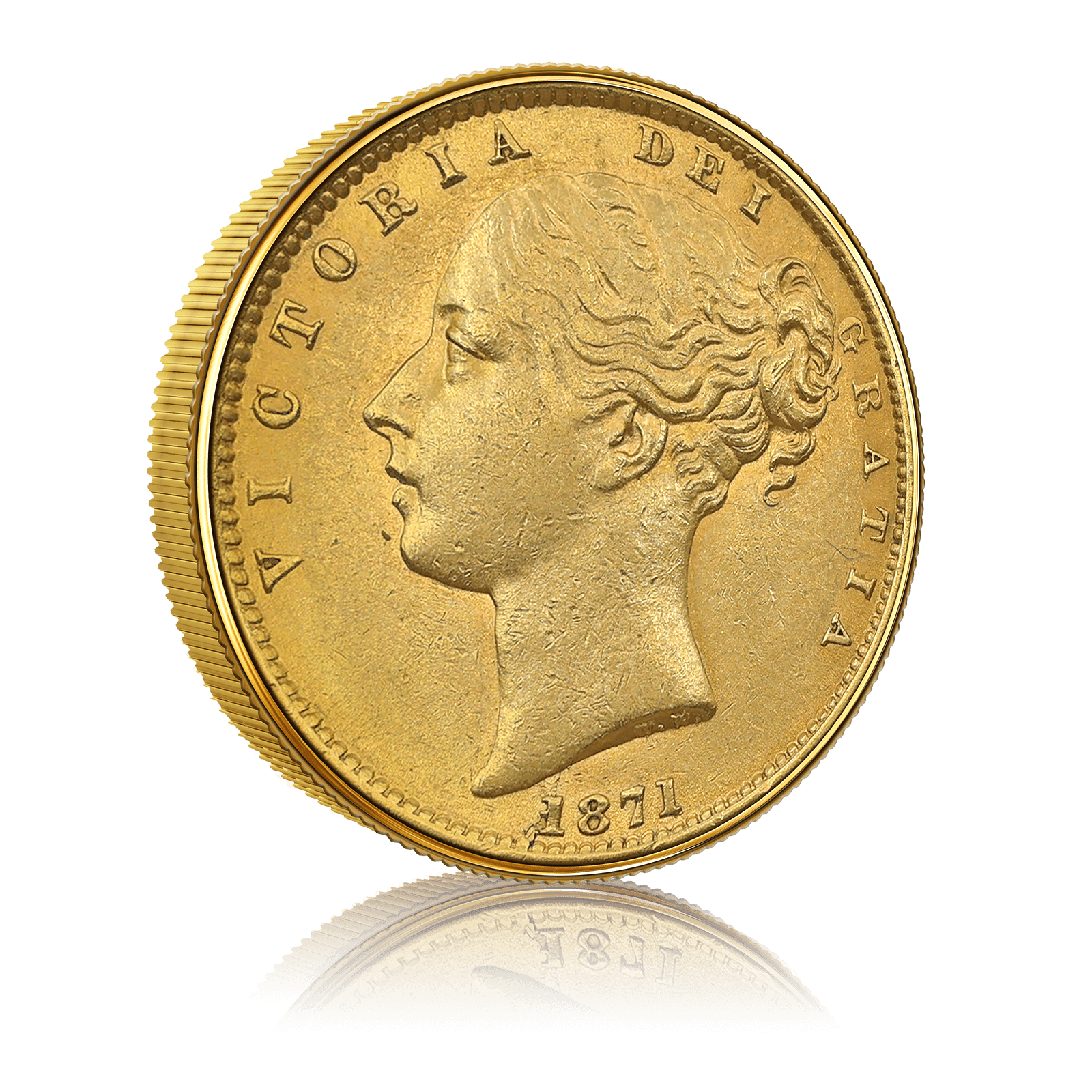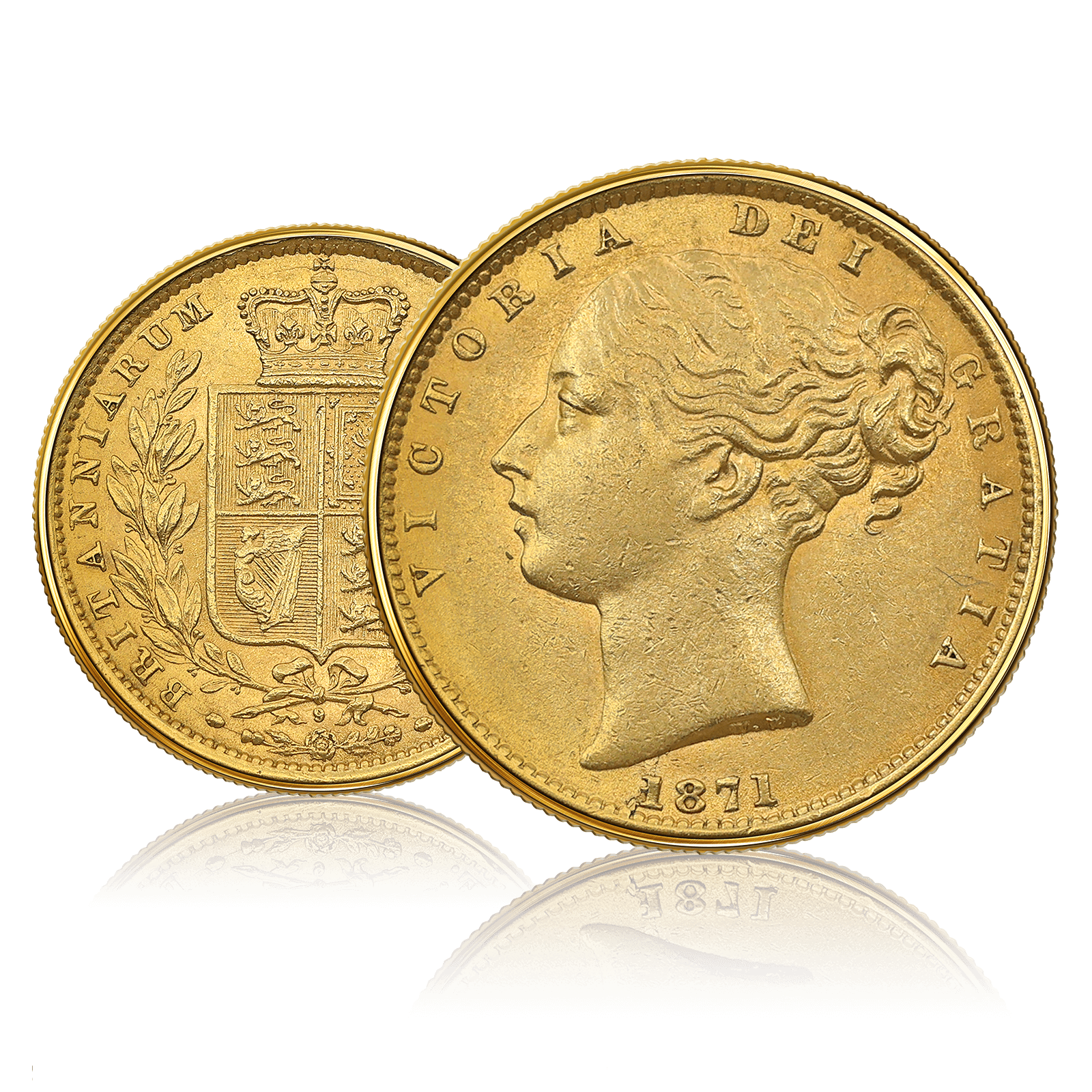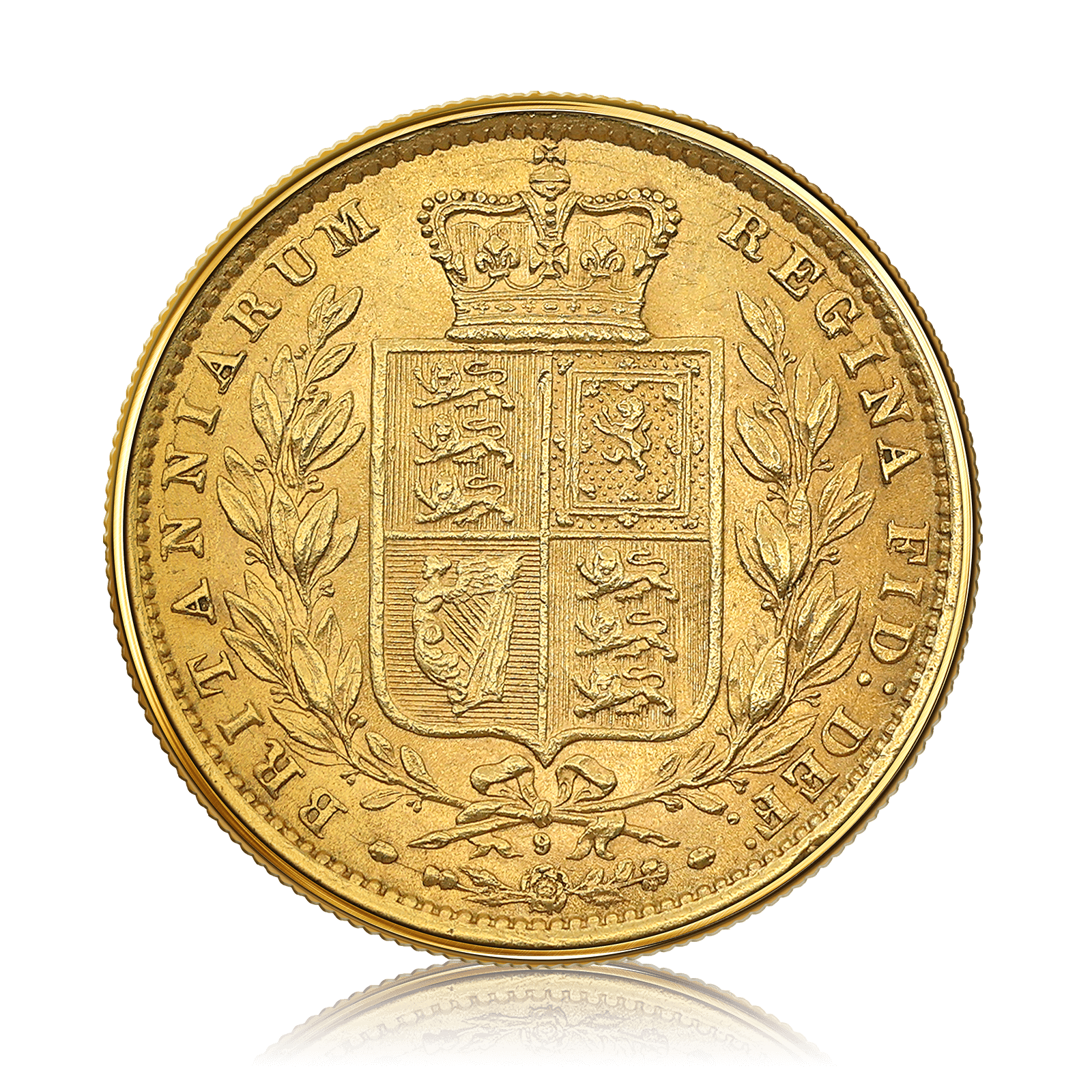 The Half Gold Sovereign Queen Victoria Young Head Shield (1871-1887) bears Queen Victoria's young picture by William Wyon on the obverse and a heraldic shield design on the reverse. It is a valuable coin due to its historical significance and excellent craftsmanship, having been struck in 22-carat gold.