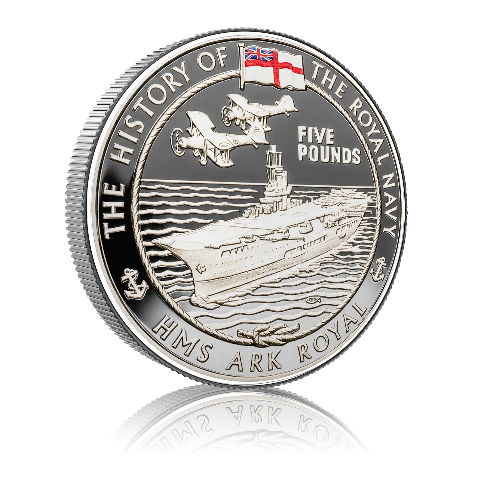 >Reverse design depicts HMS Ark Royal in action, symbolizing naval strength and history