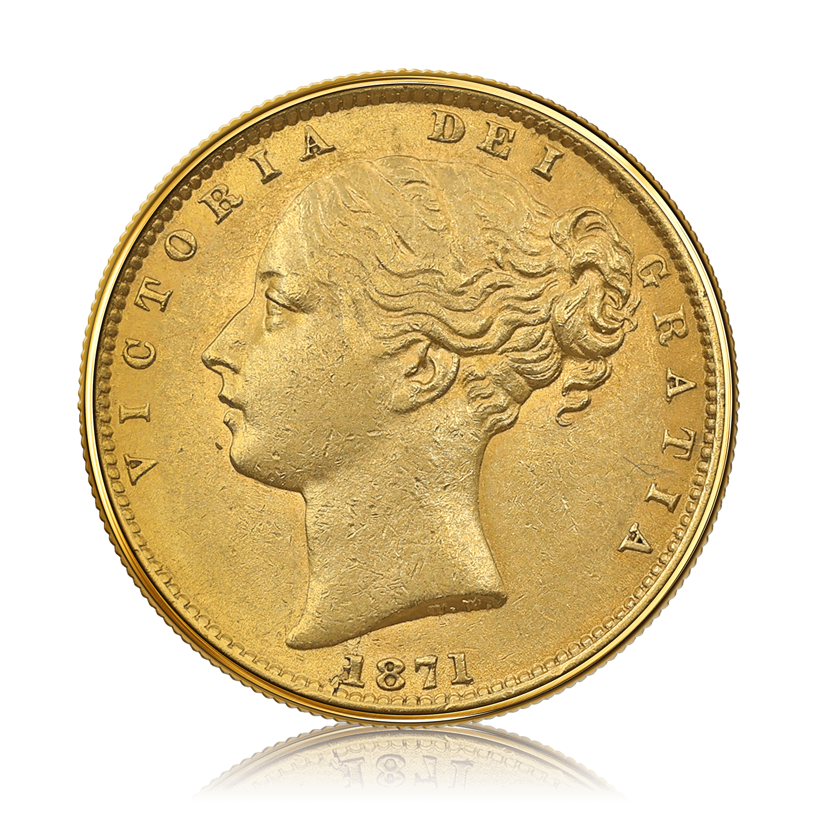 The Half Gold Sovereign Queen Victoria Young Head Shield (1871-1887) bears Queen Victoria's young picture by William Wyon on the obverse and a heraldic shield design on the reverse. It is a valuable coin due to its historical significance and excellent craftsmanship, having been struck in 22-carat gold.